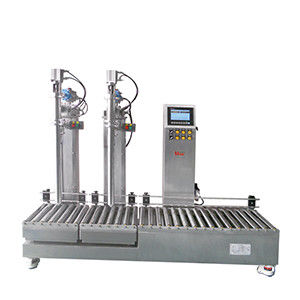 macchina di riempimento a tamburo di detersivi liquidi con due ugelli e sistema di riempimento di pesatura